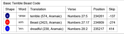 This code is interesting because both the aleph (א) the words for "terrible" and "beast" are shared in common and the cheth (ח) in the Hebrew words for "beast" and "dreadful" are also in common. The skip rate on this code is very small, meaning the "randomness risk" in this code is very low. A code searcher would consider this a very good start to a very interesting code. Click here to go to the next page to learn what this Bible Code tells us.