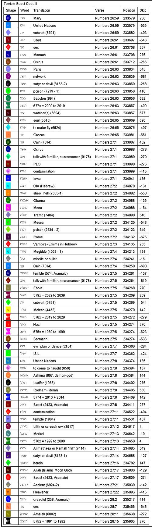 While you are waiting for further research, check out Major Tom Baird's book, The Copper Scroll Incident, which covers a lot of this material in a fiction format. Even one of the players in this code, Hillary Rodham (Clinton) plays a prominent part in this story. Most shocking to many readers is that The Major made sure that Ms. Rodham was protected, and left unhurt. The Major contends that whatever crime she has committed, it is up to a Court of Law to determine her justice, not him.