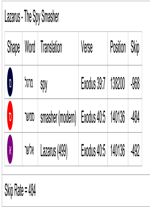 Indeed, when we started our Bible Code research on Spy Smasher, we had no idea what we would get. When we put in the two words "Spy" and "Smasher" in a matrix, they came out in a single line. But the shock came when we added Lazarus, one of the two witnesses. to this Bible Code: