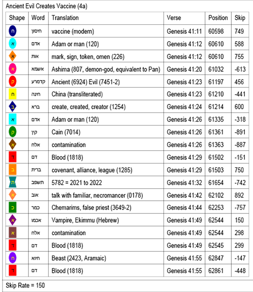 The most disturbing element of Dr. Leiber's espionage was his research in nanotechnology. He was creating transistors so small that they could penetrate cell interiors and probe their interiors. This kind of research would be very interesting to a nation like China that has been on the receiving end of the world's ire. Eventually, that is going to result in economic sanctions that could collapse their economy. Therefore, they will be obliged to find other ways to turn Dr. Lieber's technology into an eventual vaccine. In the Bible Code, the word "China" links to "Cain" suggesting these vagabonds are secretly working together (at least on this project). China needs Cain's connections with Ancient Evil and Ashima (The Joker) to contaminate the upcoming vaccine. All of these parties seem to have a vested interest in contaminating and controlling people. But how are they going to do it? Let's look at the Bible Code and see?